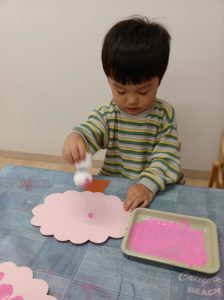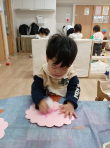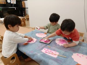 「可愛いよね~」と会話を楽しみながら絵具をぺたぺ