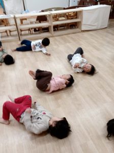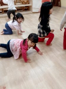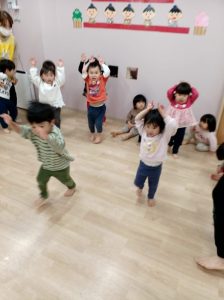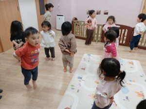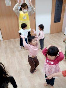 英語の歌に合わせてボールを回します。みんなドキドキ。