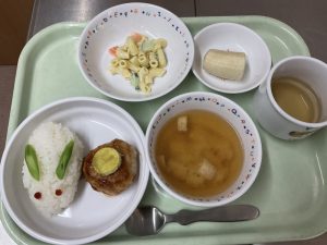 お月見ハンバーグ、うさぎのご飯、マカロニサラダ、バナナ