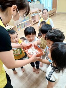 「お団子は15個あります。」とお話をすると子供達も興味深々。