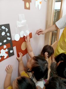 お月見の絵本を見たり、みんなで大きなお団子を貼りました!