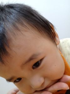 「せんせい〜」横にいて!と職員の手にお顔♡
