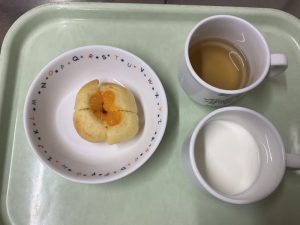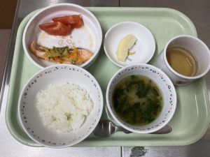 ごはん、魚のマリネ、トマト、味噌汁、りんご