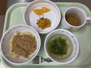 肉みそスパゲティー、かぼちゃのサラダ、スープ、オレンジ