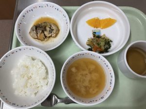 ごはん、魚のやわらか煮、胡麻和え、味噌汁、オレンジ