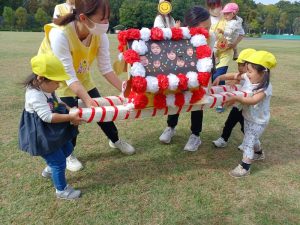 夏祭りで作ったお神輿をみんなで「わっしょい、わっしょい」