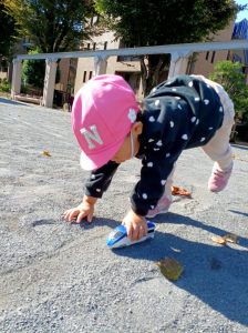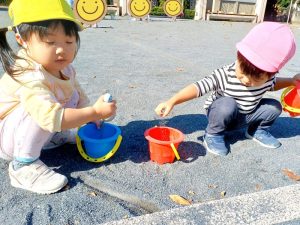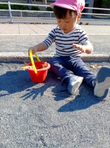 バケツに砂や落ち葉も集めよっと!