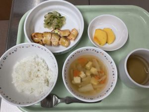 ごはん、魚の味噌マヨネーズ焼き、酢醤油和え、塩ちゃんこ汁、柿