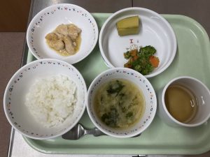 ごはん、鶏肉のねぎだれ煮、ブロッコリーのおかか和え、味噌汁、バナナ