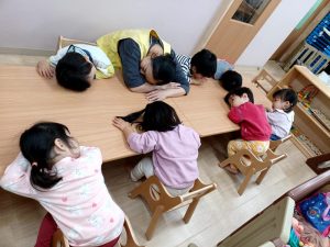 朝の会では、お眠りの歌が流れると、ほし組さんみんなでおやすみ〜