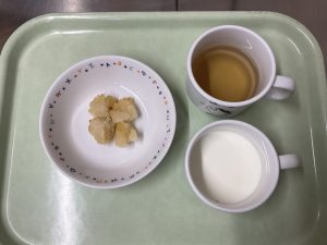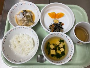 ごはん、魚の味噌煮、ひじきのツナサラダ、すまし汁、オレンジ