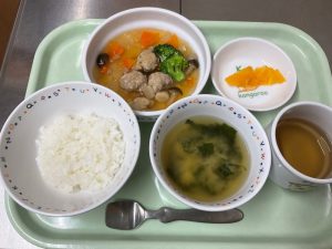 ごはん、肉団子入り秋の野山煮、味噌汁、オレンジ