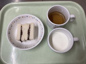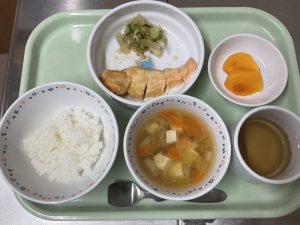 ごはん、魚の味噌マヨネーズ焼き、酢醤油和え、塩ちゃんこ汁、柿