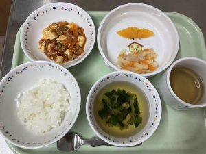 ごはん、しーほー豆腐、じゃがいもの千切り炒め、スープ、オレンジ