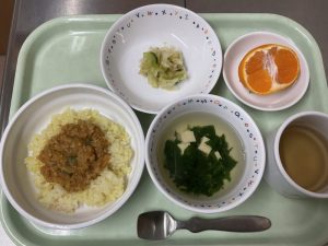 ドライカレー、キャベツの甘酢和え、スープ、みかん