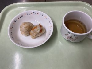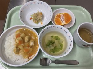 チキンカレー、甘酢和え、スープ、みかん、お茶