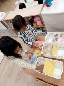 朝から口拭きとエプロンを自分たちで仕分けます!