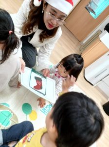 クリスマスのカードを一人1枚もらい、一緒に発音!
