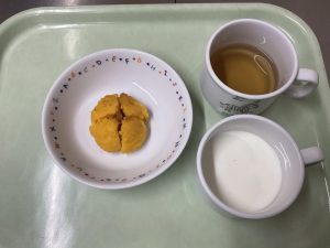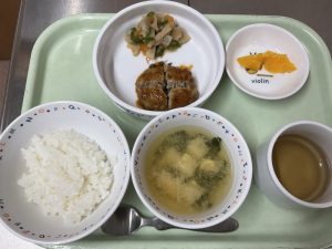 煮込みハンバーグ、れんこんの炒め物、味噌汁、オレンジ