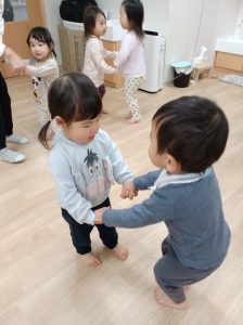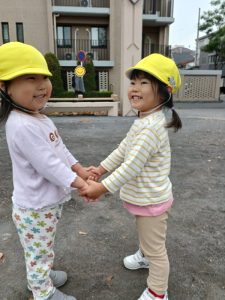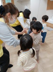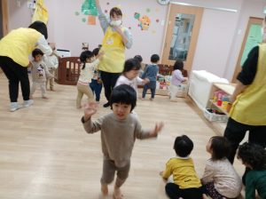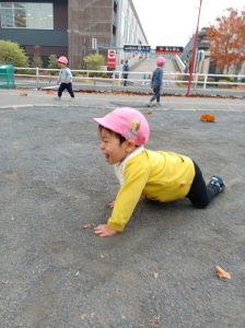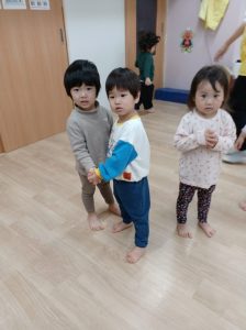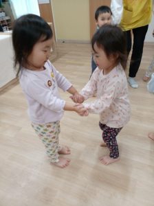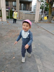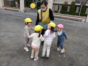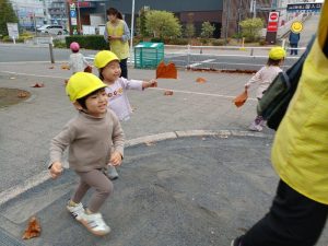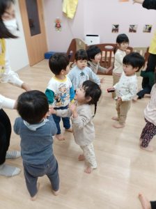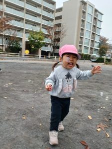 広場を元気一杯かけっこ。「まーるくなれ、輪になれ1・2・3」