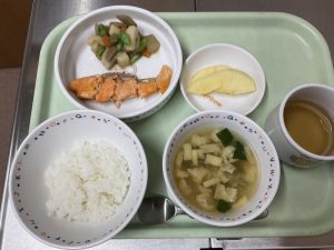魚の香味焼き、煮物、味噌汁、ご飯、りんご