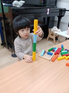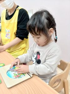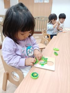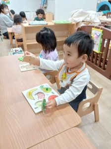 「これどこ?」と聞きながら自分で頑張って木のパズルを楽しみます。
