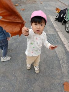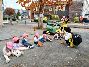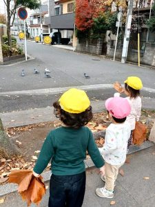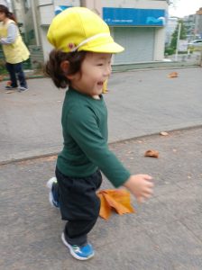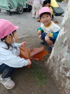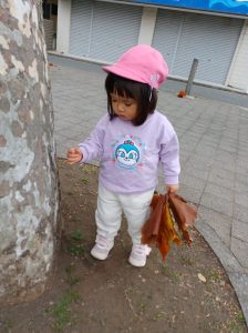 ハトさんを見たり、大きな葉っぱを沢山ひろいました。