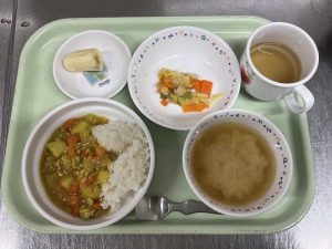 ポークカレー、胡麻和え、味噌汁、バナナ