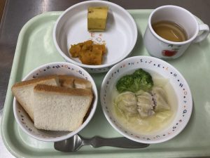 ロールキャベツ、かぼちゃのグラッセ、パン、バナナ、お茶