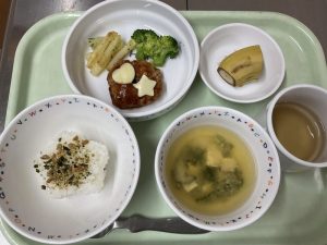 チーズハンバーグ、海苔塩ポテト、スープ、花形ご飯、バナナ