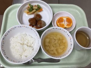 ミートボール甘辛あん、じゃがいものきんぴら、味噌汁、ごはん、みかん