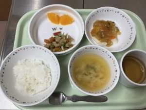 魚の野菜あんかけ、五目煮豆、味噌汁、ご飯、オレンジ