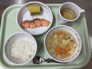 さけの西京焼き、和風ポトフ、ご飯、バナナ