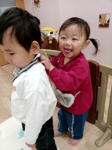 スタイがとれたお友だちに「つけてあげる~」と優しいお友だち。