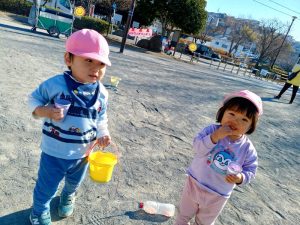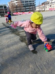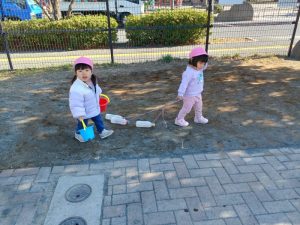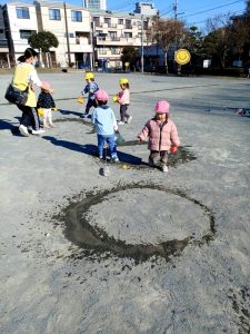 お水で線路を描いて電車ごっこを楽しみました♪