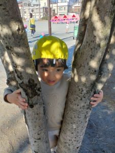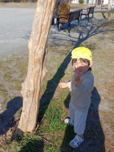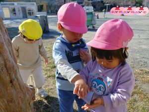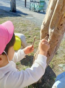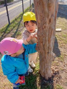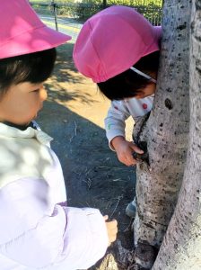 「木の穴に何かいるかな?」「一緒に見てみよう♪」