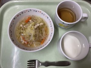 タンメン、牛乳、お茶