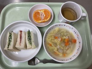 サンドイッチ、ミネストラスープ、みかん、お茶