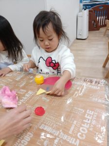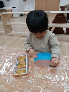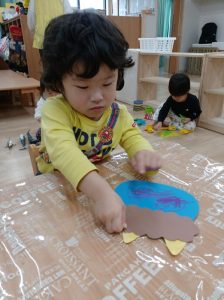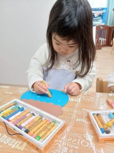 つき組さんは節分の鬼のお面の製作。お顔を描いたり、つのを糊でつけました。
