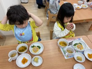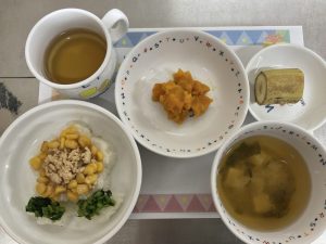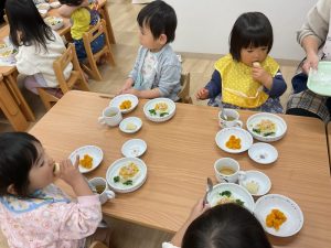今日は、誕生会メニュー。誕生児は可愛いランチョンマット!