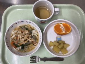 きつねうどん、さつまいものつや煮、みかん