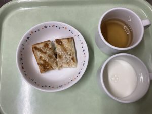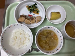 魚の照り焼き、三食和え、豚汁、ごはん、バナナ