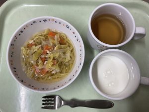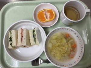 サンドイッチ、ミネストラスープ、みかん、お茶