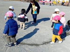 次は地面に丸を描くと、みんなでクルクル線をたどって歩きます♪