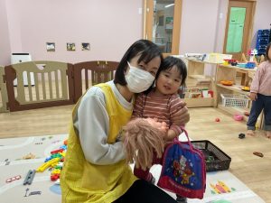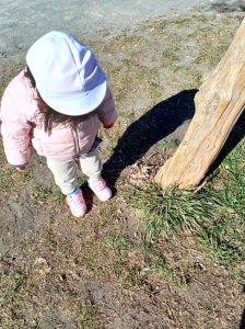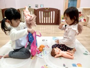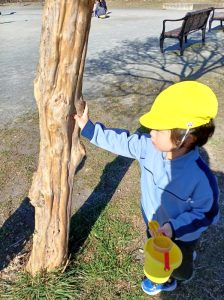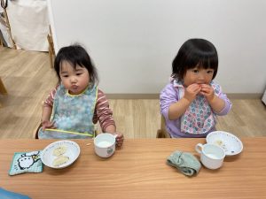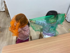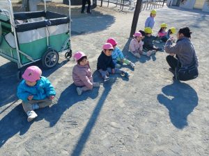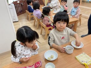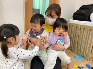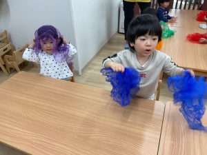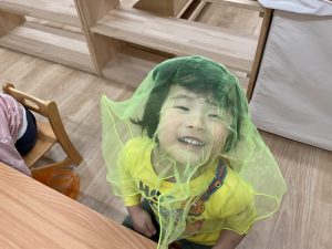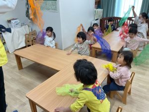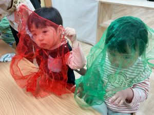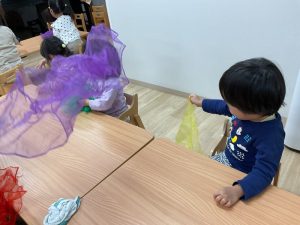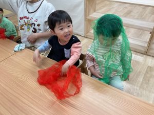 おやつの後は大好きなわらべ歌でスカーフ遊び。