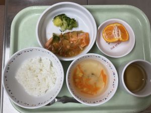魚の甘酢あん、ゆでブロッコリー、春雨スープ、みかん