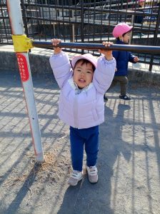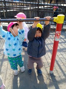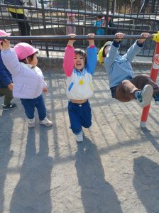 次は鉄棒「1・2・3!」腕の力がついてきました。