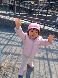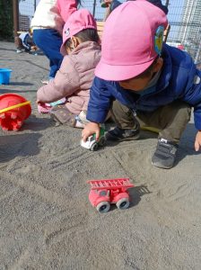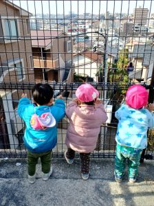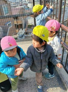公園から電車が見えます。「あ~赤だったね。」と子ども達。