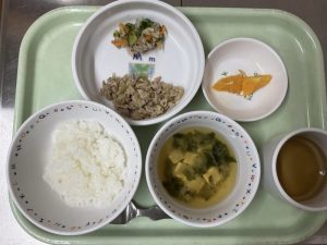 ご飯、豚肉の生姜焼き、キャベツのゆかり和え、溝汁、オレンジ、お茶