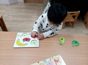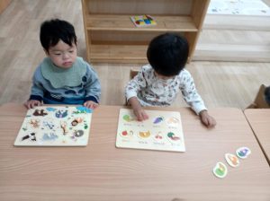 「いるかさんは、ここかな?」木のパズルも大好き♪